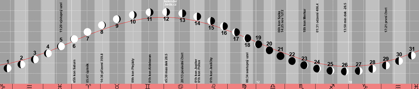 Obrázek dole je schématický graf pohybu Měsíce po obloze v průběhu celého kalendářního měsíce (nejde o přesnou mapu hvězdné oblohy, ta je totiž stranově převrácena a Měsíc se pohybuje zprava doleva - tedy přesně opačně jak na tomto grafu). Protože Měsíc se dostane do stejného místa na obloze za přibližně 27 dnů a 8 hodin (siderický měsíc), což je méně než délka jakéhokoliv kalendářního měsíce, opakuje se začátek a konec tohoto grafu. Červená křivka představuje ekliptiku, podél ní se Měsíc pohybuje na své dráze po obloze. Jednotlivé barevně odlišené úseky zobrazují dráhu kterou urazí Měsíc v průběhu konkrétního dne. Úplně dole je zvířetníkové znamení ve kterém se Měsíc právě nachází. Zhruba uprostřed každého úseku je pak fáze Měsíce pro dvanáctou hodinu tohoto dne. V grafu jsou navíc vypsány nejdůležitější astronomické úkazy pro Měsíc ve dnech, kdy nastávají. Informaci o zatmění berte pouze jako informativní, přesné údaje najdete na specializovaných serverech, viz odkazy v dalších informacích níže. Polostínového zatmění Měsíce si člověk většinou ani nevšimne. Data v grafu jsou v geocentrických souřadnicích (pohled ze středu zeměkoule), nezáleží tedy na poloze pozorovatele.
