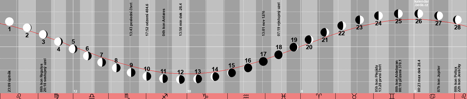 V samotném kalendáři se kromě obvyklých údajů zobrazuje i den, kdy Slunce vstupuje do nového znamení zvířetníku. A časy východu, tranzitu a západu Slunce pro Vaši zeměpisnou polohu. Tranzit (přechod) je okamžik, kdy nebeské těleso protíná místní poledník, je tedy přesně na jihu. V případě Slunce nastává takzvané pravé poledne. Pro Měsíc se v kalendáři zobrazuje den, kdy nastává hlavní fáze Měsíce. Přesný čas pak zjistíte v grafu. Též se zobrazují časy východu, tranzitu a západu Měsíce pro Vaši zeměpisnou polohu. Zde je nutné upozornit, že Měsíc se pohybuje na obloze 'divočeji', například na přiloženém obrázku je zobrazena následující situace: Měsíc je nad obzorem na jihu po půlnoci a zapadá k ránu. Přes den je pod obzorem a vychází zase až po západu Slunce. Toto chování Měsíce závisí na poloze vůči Slunci, tedy na fázi Měsíce. Více na stránce Jak jednoduše určit čas východu a západu Měsíce. Astronomické údaje platí pro zeměpisné souřadnice 50° severní šířky a 15° východní délky středoevropského (letního) času. Tyto souřadnice lze změnit na stránce Moje zeměpisné souřadnice.